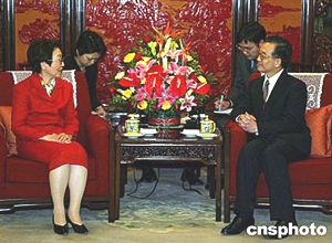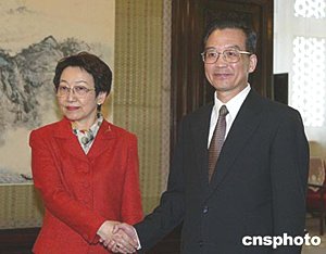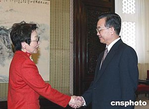 中國(guó)國(guó)務(wù)院總理溫家寶四月三日在北京中南海會(huì)見(jiàn)日本外相川口順子。中新社記者:滿會(huì)喬