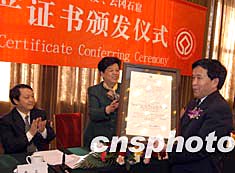 四月六日,來自云南、山西、北京、南京的代表歡聚北京人民大會(huì)堂,參加由中國聯(lián)合國教科文組織全國委員會(huì)等舉辦的世界遺產(chǎn)證書頒發(fā)儀式。國務(wù)委員陳至立向被列入聯(lián)合國教科文組織《世界遺產(chǎn)名錄》的云南“三江并流”、山西“云岡石窟”、北京“明十三陵”、南京“明孝凌”等的代表頒發(fā)了證書。中新社記者:任海霞