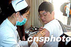 四月九日上午,福州市造血干細胞志愿捐獻者劉忠堅在福建腫瘤醫(yī)院接受干細胞動員劑注射。劉先生是在二月志愿獻血分型檢測時被發(fā)現(xiàn)與正在接受治療的福州李姓白血癥患者初配成功的。作者:鄭祚聲