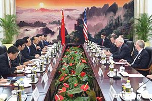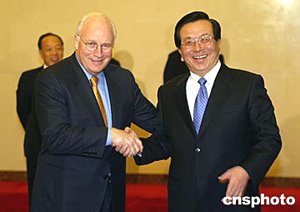 中國(guó)國(guó)家副主席曾慶紅四月十三日在北京人民大會(huì)堂與來(lái)訪的美國(guó)副總統(tǒng)切尼舉行會(huì)談。中新社記者:毛建軍