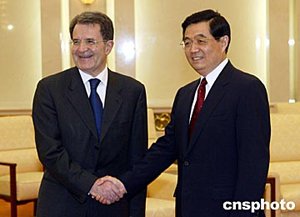 中新社北京四月十四日電(記者 齊彬)中國國家主席胡錦濤今天下午在人民大會堂會見了歐盟委員會主席普羅迪,賓主雙方進行了友好談話。