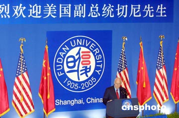第一次訪問(wèn)上海的切尼被邀請(qǐng)?jiān)趶?fù)旦大學(xué)發(fā)表演講。他說(shuō),中國(guó)在近幾十年來(lái)取得了非常矚目的成就。雖然五十年前,美中兩國(guó)曾是敵人,當(dāng)時(shí)彼此都視對(duì)方為重大的威脅。但他認(rèn)為這種情況已經(jīng)發(fā)生變化,因?yàn)槿缃褚紤]到雙方的共同利益,要在世界發(fā)展和平與穩(wěn)定,美中在很多問(wèn)題上都共同合作。