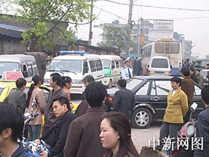 在距事故現(xiàn)場約三公里的地方,各主要交通干道已經(jīng)設(shè)置了路障,不允許車輛進(jìn)入。在離化工廠約兩公里處,醒目的警戒線已經(jīng)攔住了公路,數(shù)十名警察正在幫助附近的居民疏散。