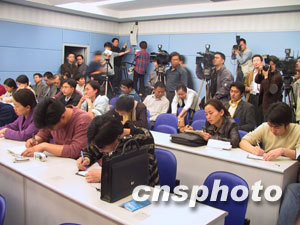 圖為情況通報(bào)會(huì)現(xiàn)場緊張忙碌的記者們。作者:郭晉嘉 范卉