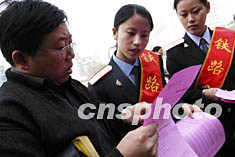 四月十八日,山西省太原火車站的工作人員向過往旅客發(fā)放新列車時(shí)刻表。當(dāng)日是全國(guó)鐵路提速第一天,太原火車站設(shè)立咨詢臺(tái),為旅客提供鐵路提速等各方面的信息。作者:陳帆
