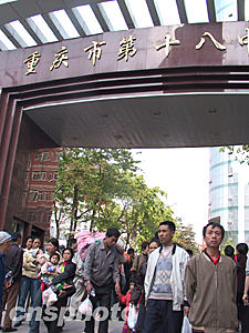 四月十八日下午四點(diǎn)多,被臨時(shí)安置在重慶市第十八中學(xué)的群眾得到"可以回家"通知,大家歸心似箭。為急于回家的群眾涌出該學(xué)校大門(mén)。作者:郭晉嘉