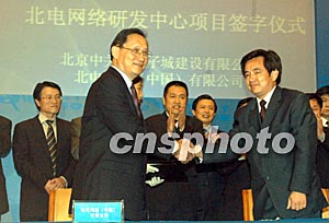 四月十九日,北電網(wǎng)絡(luò)與北京中關(guān)村電子城建設(shè)有限公司在“新北京,新奧運——中國和世界的商機”奧運經(jīng)濟市場推介會上洽談,創(chuàng)建北電網(wǎng)絡(luò)研發(fā)中心。圖為北電網(wǎng)絡(luò)全球副總裁毛渝南(左)與北京中關(guān)村電子城建設(shè)有限公司簽約。