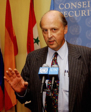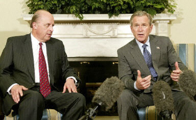 4月19日,美國總統(tǒng)布什(右)在白宮舉行儀式,提名美國常駐聯(lián)合國代表內(nèi)格羅蓬特(左)在6月30日伊拉克權(quán)力交接后出任美國首任駐伊大使。該任命還將通過參議員的審議。內(nèi)閣羅彭特現(xiàn)年64歲,將在6月30日美伊交權(quán)后走馬上任。