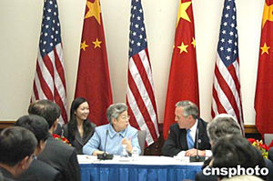 四月二十一日在美國(guó)華盛頓舉行的第十五屆中美商貿(mào)聯(lián)委會(huì)上,中國(guó)國(guó)務(wù)院副總理吳儀告訴美國(guó)人:中美經(jīng)貿(mào)并非此消彼長(zhǎng),而是互利雙贏。圖為吳儀與美國(guó)商務(wù)部部長(zhǎng)埃文斯共同會(huì)見(jiàn)記者。作者:余東暉