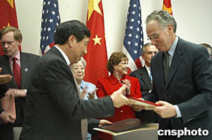 中美商貿(mào)聯(lián)委會(huì)達(dá)成8項(xiàng)協(xié)議,這是中國(guó)質(zhì)檢總局局長(zhǎng)李長(zhǎng)江與美國(guó)農(nóng)業(yè)部長(zhǎng)維尼曼簽署建立食品安全和動(dòng)植物建議磋商機(jī)制意向書(shū)。中新社記者 余東暉 攝