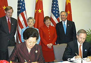 中美在四月二十一日結(jié)束的第十五屆中美商貿(mào)聯(lián)委會(huì)上,就“高技術(shù)出口最終用戶訪問(wèn)”達(dá)成協(xié)議,這將推動(dòng)美國(guó)對(duì)華高科技出口。圖為中國(guó)商務(wù)部副部長(zhǎng)馬秀紅(左)與美國(guó)商務(wù)部副部長(zhǎng)杰斯特(右)在簽字。作者:余東暉