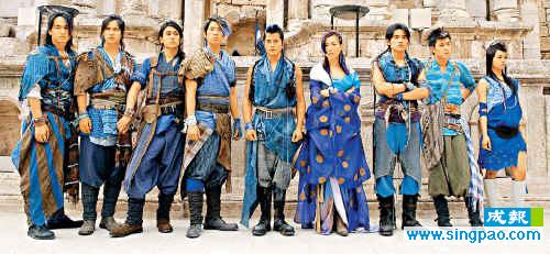 中新網(wǎng)4月22日電 據(jù)香港成報(bào)報(bào)道,九位百事巨星云集安曼古城,各自穿上古裝一字排開,氣勢十足。站在中央的依然是百事老大哥郭富城,天后鄭秀文站在他身旁,F(xiàn)4的少俠打扮各有特色,cool味十足,而周杰倫與蔡依林被陳冠希分隔開。九人的造型都是以藍(lán)色為主,周杰倫還扎上長辨,令人甚為新鮮。