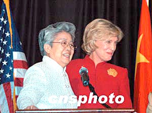 中國副總理吳儀22日晚上向美國政界工商界發(fā)表入情如理的演講,受到好評。演講后,主持人、美國美國前商務(wù)部長芭芭拉.富蘭克林(右)稱贊吳儀演講“沒有一句廢話”。中新社記者:余東暉