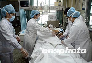 四月二十三日,北京大學人民醫(yī)院重癥監(jiān)護室(ICU)的醫(yī)生護士在護理外科手術(shù)后的患者。北京市新確診的一例SARS疑似患者,四月十四日轉(zhuǎn)入該院后一直在遠離這里的呼吸科監(jiān)護室治療。中新社記者:任晨鳴