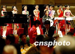 四月二十三日,海南省人民政府舉行晚宴歡迎出席博鰲亞洲論壇2004年年會的嘉賓,來自廣東的芳華十八另類女子民樂隊(duì)為晚宴助興。中新社記者:鄭萍萍
