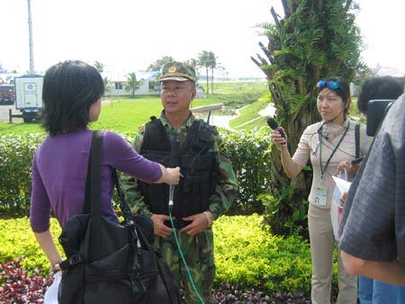 博鰲亞洲論壇2004年年會(huì)于4月24日在海南博鰲開幕。本次論壇年會(huì)主題為“亞洲尋求共嬴——一個(gè)對(duì)世界開放的亞洲”,表明2004年博鰲亞洲論壇年會(huì)將在全球背景下,探討亞洲各國(guó)和地區(qū)區(qū)域經(jīng)濟(jì)合作問題,尋求亞洲共同進(jìn)步的有效途徑。圖為記者采訪負(fù)責(zé)博鰲亞洲論壇安全保衛(wèi)工作的“鐵甲軍人”。(春風(fēng))