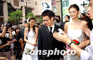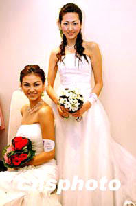 4月24日,香港名模Rosemary和李嘉慧【右】穿著亮麗婚紗,為Miryoku在香港開設(shè)的美容院宣傳助興。