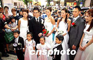 日本美容品牌Miryoku在香港首度開設(shè)Miryoku Beauty Salon美容院,4月24日舉行開幕儀式,邀請(qǐng)城中藝人吳浩康[左二]、陳鍵鋒[右二]、名模Rosemary[左三]和李嘉慧[右三]出席,俊男美女穿上婚紗禮服在花童和伴娘的襯托下,由鬧市步入會(huì)場(chǎng)。作者:洪少葵