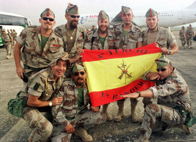 4月28日,248名西班牙最后一批駐伊作戰(zhàn)士兵乘飛機(jī)從科威特回國(guó)。圖為駐伊拉克的西班牙士兵到達(dá)西班牙西南部的Badajoz后與一面軍旗合影。
