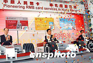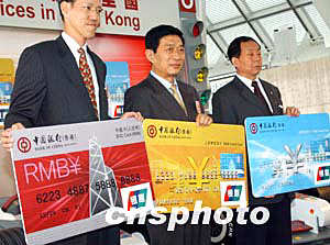 中國銀行(香港)有限公司四月二十九日在香港正式宣布,于四月三十日率先推出中銀人民幣卡系列,包括中銀人民幣信用卡和中銀卡(人民幣),設(shè)有普通卡和金卡,卡面印有"銀聯(lián)"標(biāo)志,可用于“銀聯(lián)”遍布全國多個(gè)省市約40萬個(gè)商號網(wǎng)點(diǎn)。人民幣信用卡亦可用于香港貼有“銀聯(lián)”標(biāo)志及香港地區(qū)的中銀香港、南洋商業(yè)銀行及集友銀行屬下的自動柜員機(jī)24小時(shí)提取人民幣或港幣的便利服務(wù)!爸秀y人民幣卡系列”啟動儀式。作者:錢興強(qiáng)