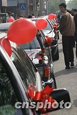 “五一”假期,北京市民辦喜事的特別多,裝扮一新的婚車在馬路旁排成了行。中新社記者:史利