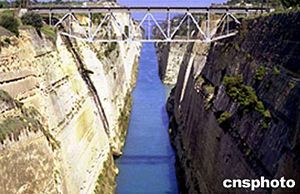 科林斯運(yùn)河位于希臘首都雅典西南與伯羅奔尼撒半島地峽處,完成于1893年,長6公里,寬23米,河面距地面橋梁深達(dá)約80米,如利刃將半島與大陸筆直地切開。該運(yùn)河由拖輪牽引仍可通過萬噸輪船。作者:田地