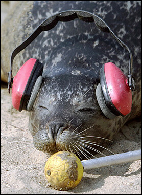一個正在接受科學研究的14歲海豹頭戴耳機,樣子憨態(tài)可掬。