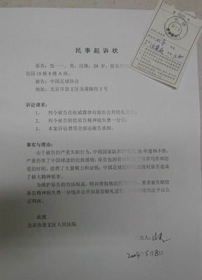 目前,他已聘請了知名律師,寫好了起訴狀書,要求法院判決中國足協(xié)賠償他一分錢的精神損失費,“我已經(jīng)于8日下午向北京市崇文區(qū)人民法院立案庭以掛號信的方式遞交了起訴書!”