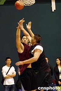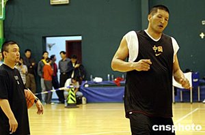 五月十一日,備戰(zhàn)雅典奧運會的中國國家男子籃球隊在北京進行公開訓練,剛剛回國的NBA球員巴特爾參加了合練。中新社記者:盛佳鵬