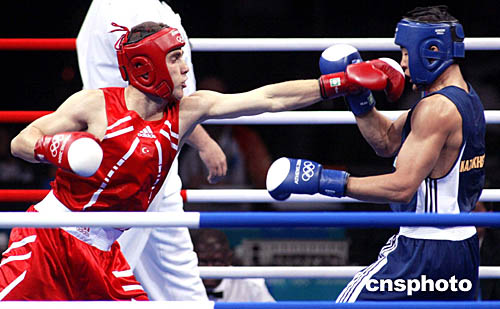圖為土耳其選手TARHAN Ihsan Yildirim和哈薩克斯坦選手SHUMENOV Beibut在男子81公斤級拳擊賽中不遺余力地打擊對方的要害部位。