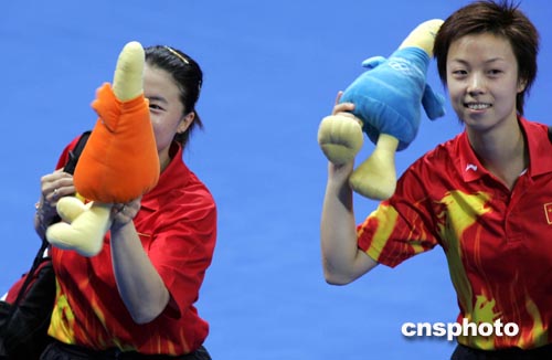 因?yàn)橐?guī)則限制,中國(guó)選手只能有一組進(jìn)入決賽,這也使得在決賽中王楠/張怡寧這對(duì)組合必須要擊敗對(duì)手。決賽中,王楠和張怡寧在第一局與對(duì)手展開(kāi)激烈爭(zhēng)奪,并以十一比九拿下這關(guān)鍵一局。此后她們發(fā)揮越來(lái)越好,也非常興奮,連續(xù)以十一比七和十一比六拿下第二和第三局,以總比分三比零領(lǐng)先。