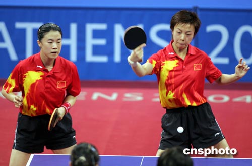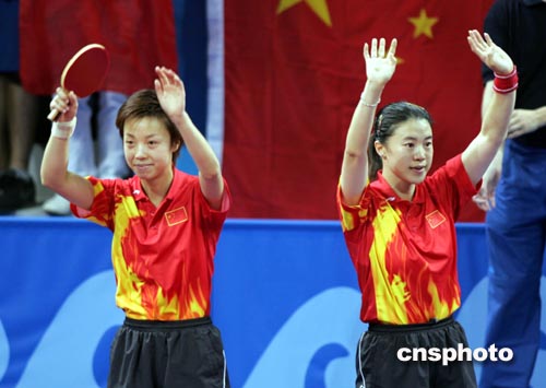 當(dāng)?shù)貢r(shí)間8月20日下午,中國(guó)乒乓球選手王楠、張怡寧在決賽中以4比0輕取韓國(guó)選手,獲得本屆奧運(yùn)會(huì)女子雙打冠軍。中新社記者:任晨鳴