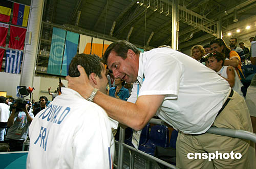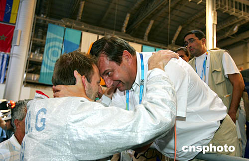 圖為在法國(guó)隊(duì)奪取男子配劍團(tuán)體冠軍后,法國(guó)體育部長(zhǎng)拉穆爾擁抱選手的場(chǎng)面。
