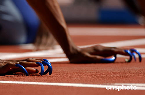 美國(guó)“女飛人”蓋爾-德弗斯第五次出征奧運(yùn)會(huì),她曾在25屆和26屆奧運(yùn)會(huì)上連續(xù)贏得100米短跑金牌。圖為她的那個(gè)起跑前獨(dú)一無(wú)二的預(yù)備動(dòng)作——用手背貼地而彎起長(zhǎng)長(zhǎng)的美麗指甲。