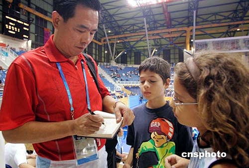 雅典奧運(yùn)會(huì)乒乓球比賽期間,坐在觀眾席上觀戰(zhàn)的中國乒乓球總教練蔡振華成了外國小球迷追逐的明星。中新社記者:張煒
