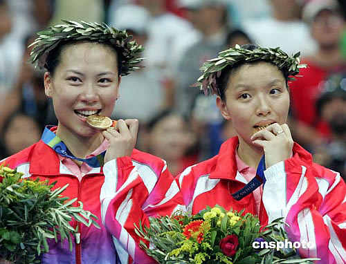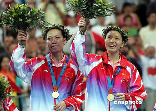 中新社雅典八月二十一日電 廣東球員張潔雯/楊維今天在奧運會羽毛球女雙決賽中,戰(zhàn)勝世界冠軍黃穗/高崚,奪得金牌。
