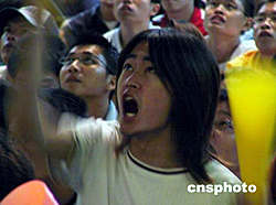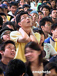 中國(guó)臺(tái)北隊(duì)在雅典奧運(yùn)會(huì)棒球賽中3:4惜敗日本隊(duì),臺(tái)北球迷為之惋惜。中新社記者:曾嘉