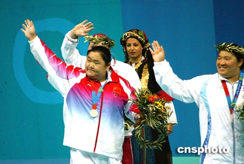 當(dāng)?shù)貢r(shí)間8月21日,中國選手唐功紅在雅典奧運(yùn)女子75公斤以上級(jí)舉重比賽中,打破挺舉和總成績兩項(xiàng)世界紀(jì)錄,奪得該項(xiàng)目的金牌。中新社記者:王瑤