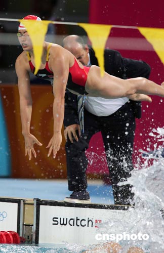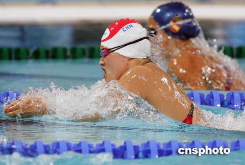 當?shù)貢r間八月二十一日晚,中國游泳名將羅雪娟在雅典奧運女子四乘一百米混合泳接力比賽中竭盡全力,賽后因體力耗盡,幾乎昏倒。中新社記者:毛建軍