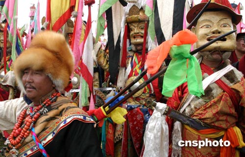 頭戴斑斕面具的藏族寺廟儀仗隊(duì)聲勢奪人。