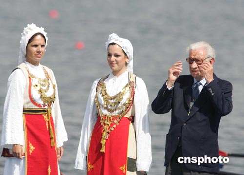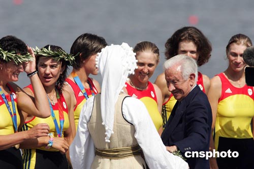 當(dāng)?shù)貢r(shí)間八月二十二日,國(guó)際奧委會(huì)前主席薩馬蘭奇出席賽艇比賽頒獎(jiǎng)儀式。中新社記者:毛建軍