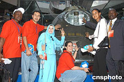 由中國(guó)共青團(tuán)中央主辦的首屆中非青年聯(lián)歡節(jié)八月二十三日在北京拉開序幕。圖為非洲青年參觀中國(guó)科技館,并與神舟一號(hào)返回艙合影留念。作者:張宇