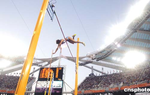 圖為當(dāng)?shù)貢r間21日舉行的女子撐竿跳資格賽比賽現(xiàn)場。