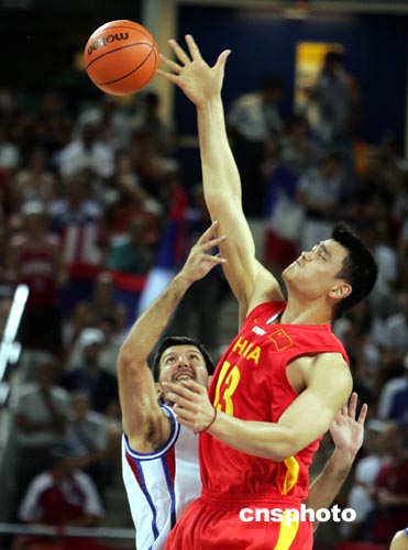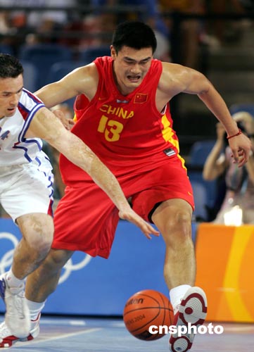 當?shù)貢r間八月二十三日下午,中國男籃在雅典奧運會小組賽最后一場比賽中以67:66一分險勝塞黑隊,闖入前八名,姚明打滿全場,依然是球隊獲勝的頂梁柱。中新社記者:任晨鳴