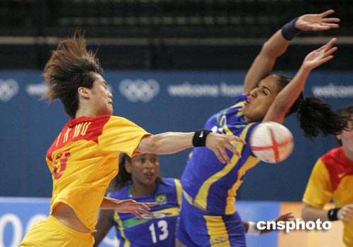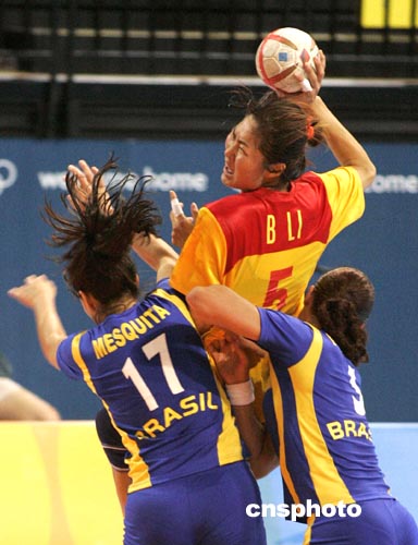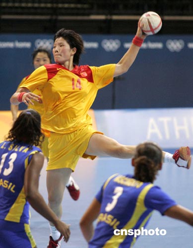 當(dāng)?shù)貢r間8月23日下午,在雅典奧運女子手球比賽中,中國女子手球隊(黃)以28比23力克巴西隊。中新社記者:張煒