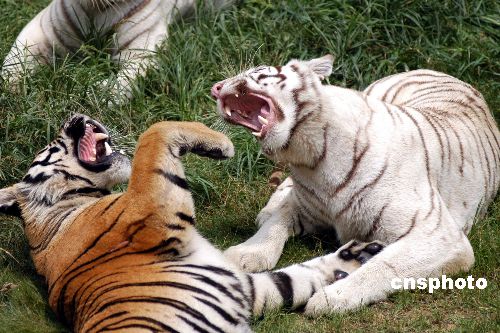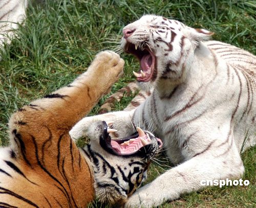 8月22日,在南京紅山森林野生動(dòng)物園獅虎園內(nèi),一只白虎和另一只老虎十分親熱,一會(huì)相互張嘴,一會(huì)相互擁抱……盡情享受秋日的涼爽。江南(南京) 攝