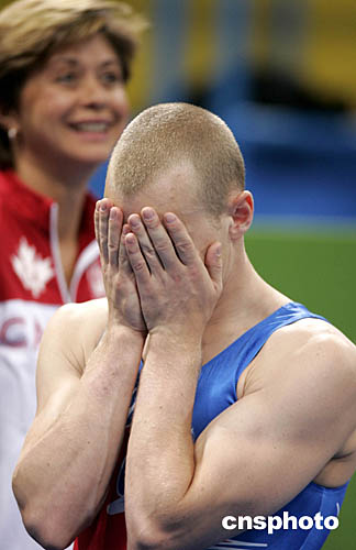 圖為加拿大選手休費爾特(SHEWFELT Kyle)以9.787分的成績奪得男子自由體操冠軍后潸然淚下的鏡頭。