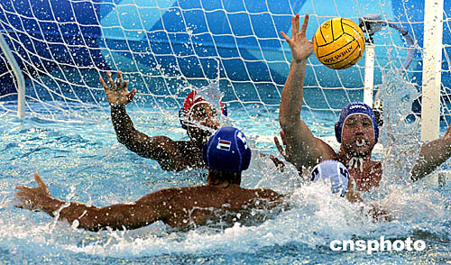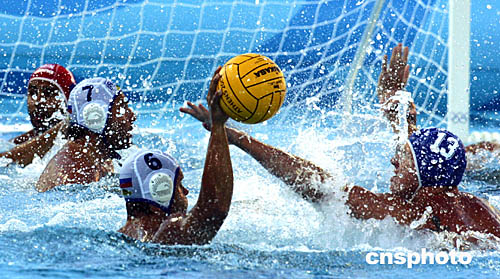 圖為在當?shù)貢r間8月23日舉行的埃及隊和西班牙隊的水球比賽畫面。
