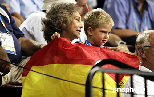 圖為西班牙皇后索菲亞與她的孫子在觀看西班牙隊(duì)和德國(guó)隊(duì)的手球比賽。