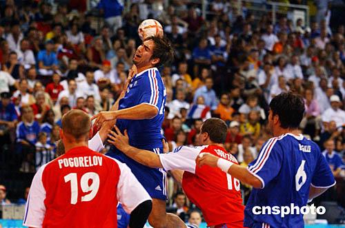 圖為在當(dāng)?shù)貢r間8月24舉行的男子手球法國隊(duì)與陣俄羅斯隊(duì)的1/4決賽中,法國隊(duì)Nikola Karabatic的精彩表現(xiàn)。